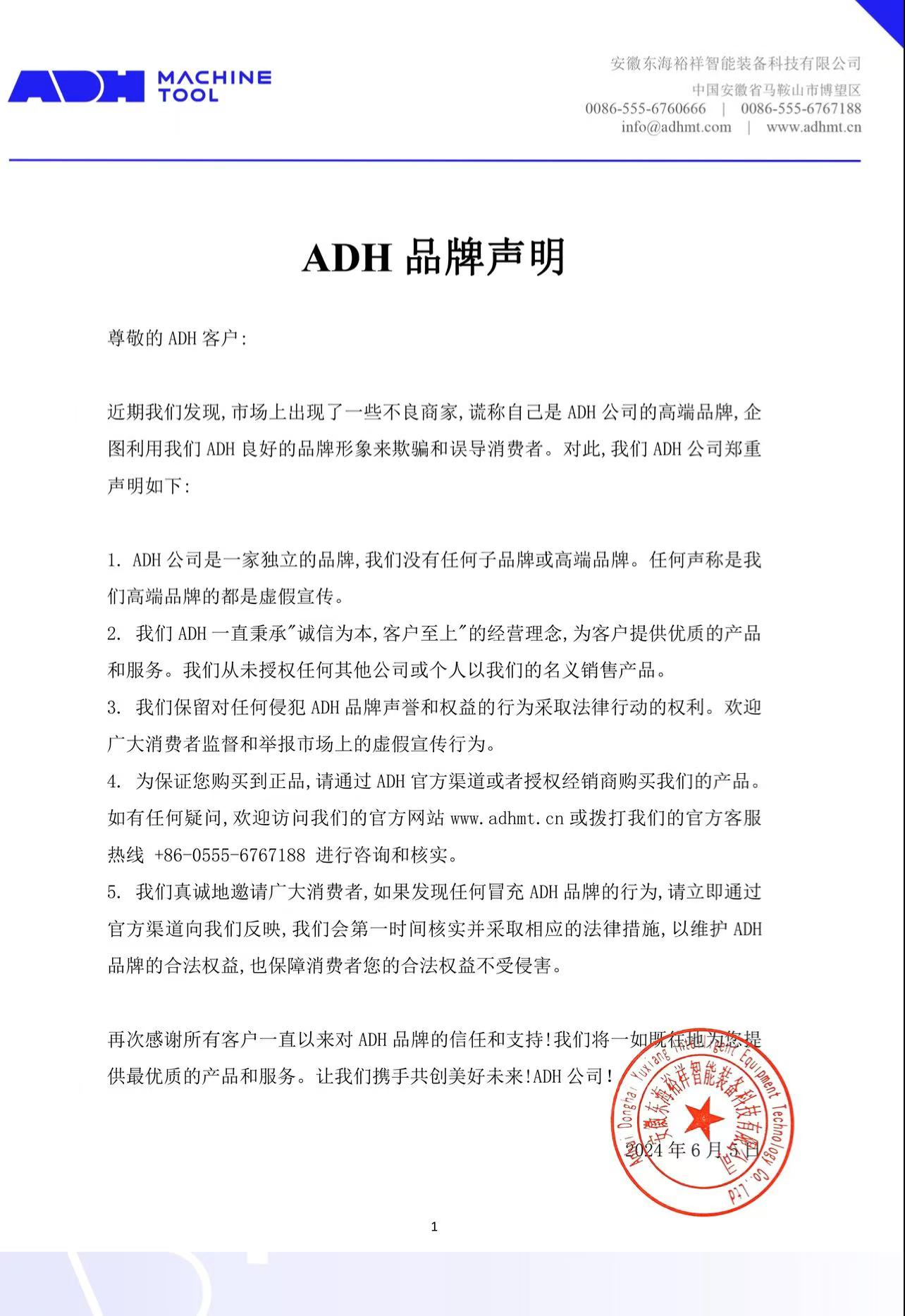 最近,我們發(fā)現(xiàn)市場上有一些不良商家 謊稱是 ADH 機床的高端品牌,企圖利用 "ADH "良好的品牌形象欺騙和誤導消費者。對此,我們 ADH 公司在此鄭重聲明如下: