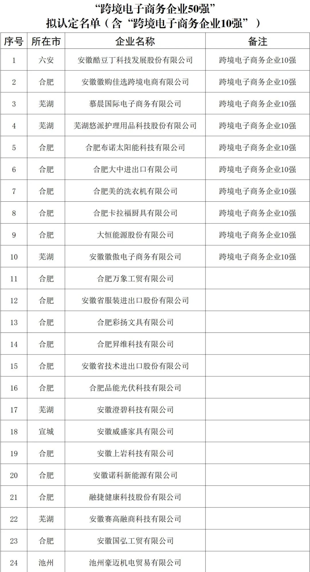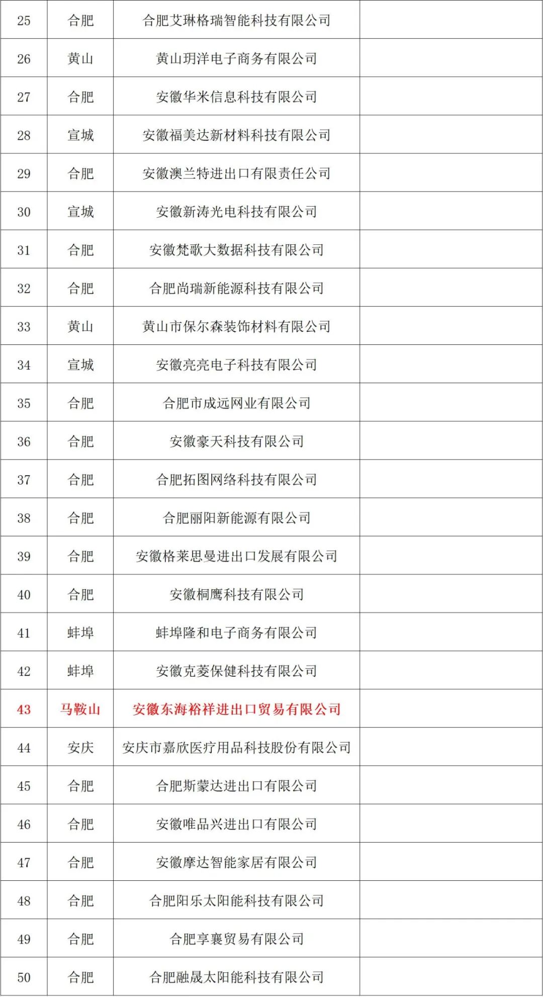 近日,安徽省商務廳正式發布《關于安徽省跨境電子商務及海外倉重點企業(2024年度)認定情況的公示》,安徽東海裕祥進出口貿易有限公司(安徽東海裕祥智能裝備科技有限公司的全資子公司)憑借全球化運營體系與創新跨境生態布局,強勢入選“安徽省跨境電子商務企業50強”,成為馬鞍山市截至目前僅有的兩家上榜企業之一。這一省級權威認證,標志著企業在跨境出海賽道的標桿地位獲官方認可。